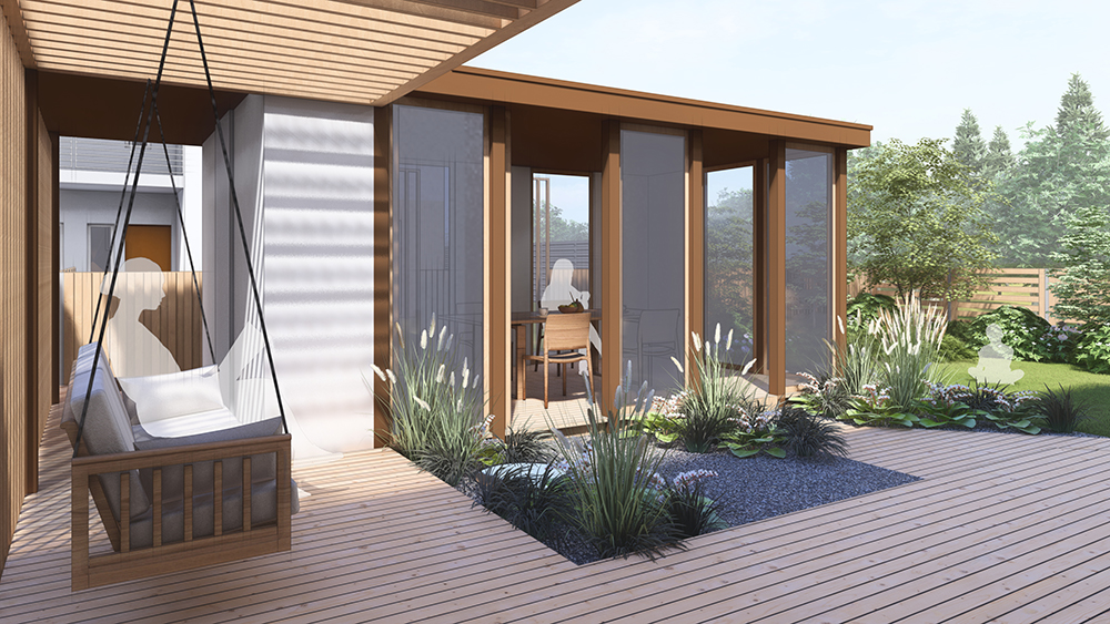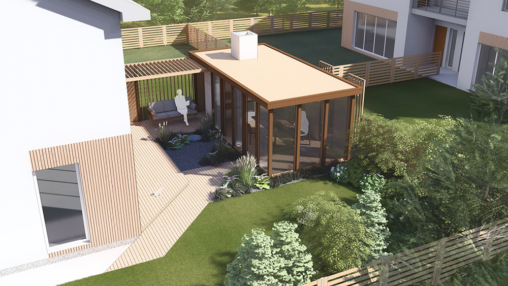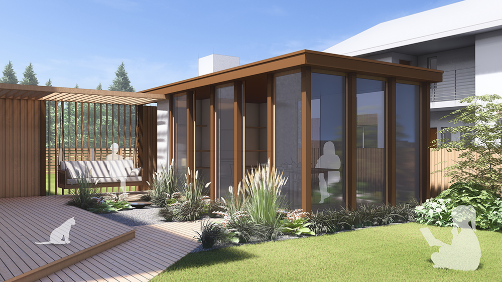 Молодая, амбициозная, современная семья с малышом, мечтала о тихом и функциональном пространстве на заднем дворе. Безопасность и современность, была неотъемлемой состаявляющей проектирования. Архитектурные решения, по наполнению функциональной постройки с камином для круглогодичного использования и уличного летнего кинотеатра - стало изюминкой проекта.