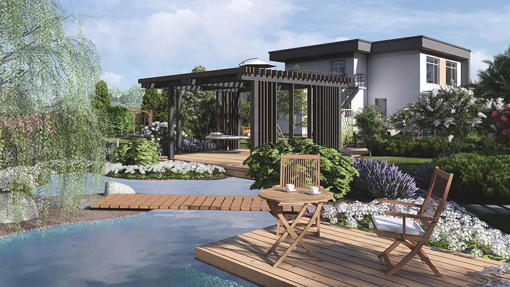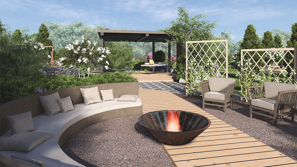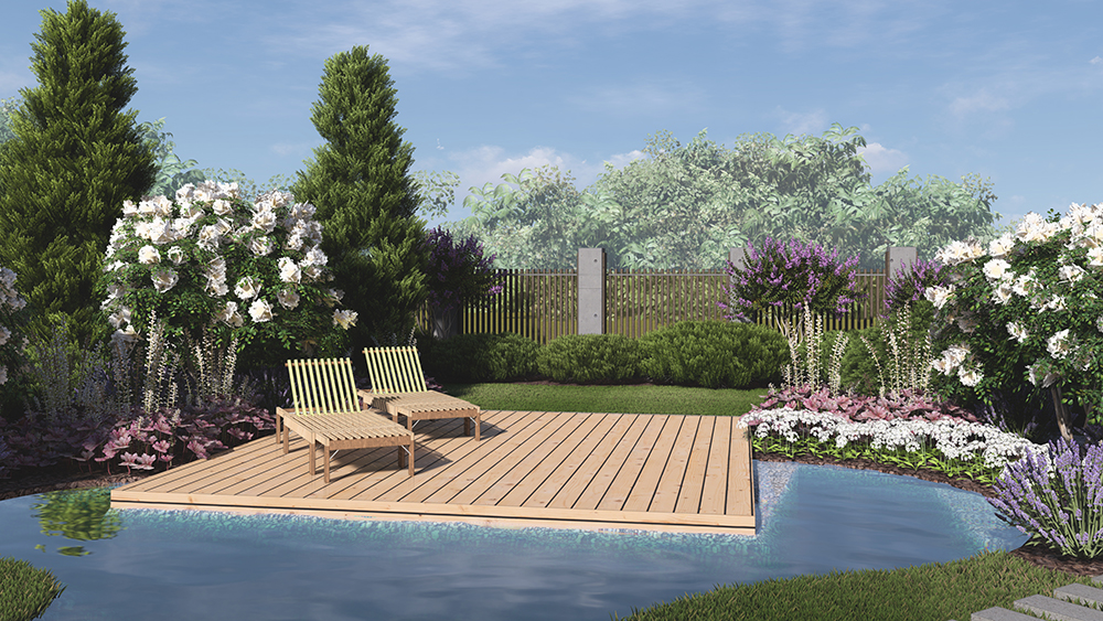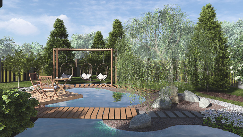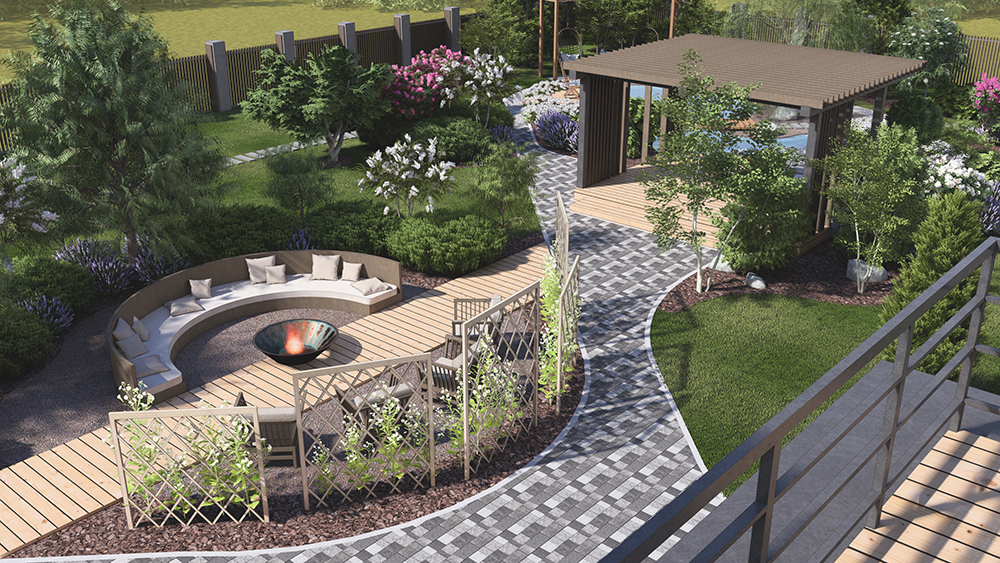 Вода ассоциируется с эмоциями, интуицией и очищением - хозяйка, а гонь олицетворяет силу, страсть и трансформацию - хозяин. Именно так мы сассоциировали наших заказчиков и разработали сад. Костровая зона является центральным и самым энергетически сильным объектом на участке. Зона водоёма, спроектирована таким образом, что находясь рядом с огнем, есть потрясающая возможность любоватьсяна открытым пространством с захватывающим дух свечением и отблексом огня в зоне водоёма. А в дневное время, лазурные оттенки ирисов, рододендронов и герани, красиво оттеняя синеву воды и гармонируя с функциональной зоной для отдыха в тени.